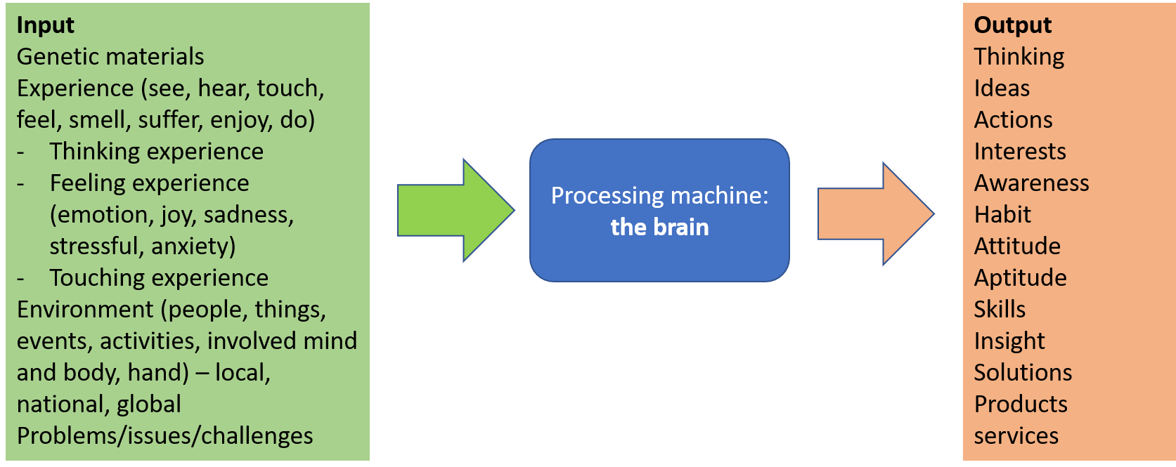 We use the initial input (raw materials) to process and produce new things and new concepts, ideas (outcome). Given the fix genetic materials that we inherit from our parents, the quality and greatness of this outcome depends on the quality of input.